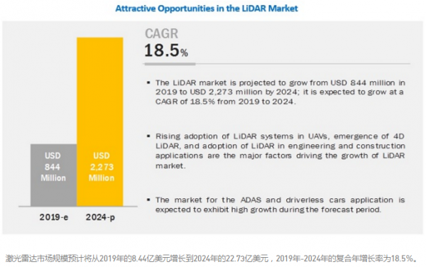 近日,MarketsandMarkets?发布了最新的2024年激光雷达市场的全球预测研究报告,报告指出,激光雷达市场规模预计将从2019年的8.44亿美元增长到2024年的22.73亿美元,2019年-2024年的复合年增长率为18.5%。